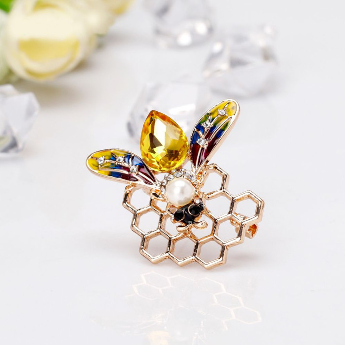 Брошка "Бджола на стільниках" – справжнє втілення елегантності та неординарності. Оригінальний дизайн, витончене поєднання золотистого сяйва металу з ніжним мерехтінням кришталиків, насичені барвами крильця та граційний силует бджілки, оздоблений перлиною і великим каменем зі штучного кришталю, створюють особливий шарм прикраси та підкреслюють її вишуканість. З такою цікавою брошкою Ви неодмінно будете привертати увагу оточення!