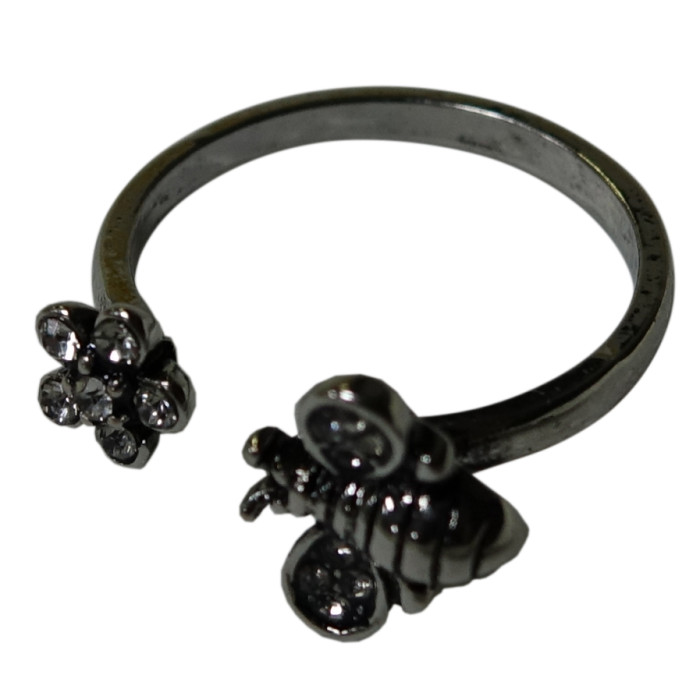 Каблучка з бджілкою – цікавий варіант біжутерії для дівчат з оригінальним дизайном, прикрашений невеликими камінцями. Виріб виконаний у формі кільця з однієї сторони декорованого бджілкою, з іншої – квіткою. Ця прикраса стане ідеальним подарунком для жінки чи дівчини, яка захоплюється дивовижним світом природи