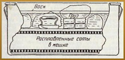 Мал. 2. Простий пристрій для повільного отримання воску. Розплавлені стільники знаходяться в полотняному мішку між щитами з рейок і планок.