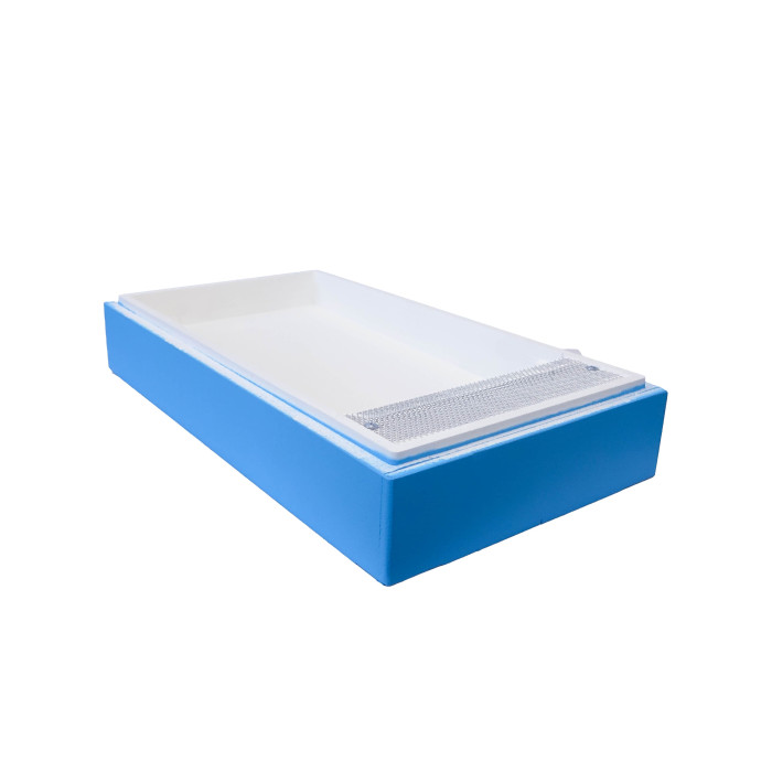 Годівниця виготовлена з легкого і міцного пінополістиролу. Конструкція передбачає 2 відділення – для корму та для проходу бджіл, розділені невисокою пінополістирольною перегородкою та металевою сіткою. Така конструкція запобігає загибель бджіл у сиропі.