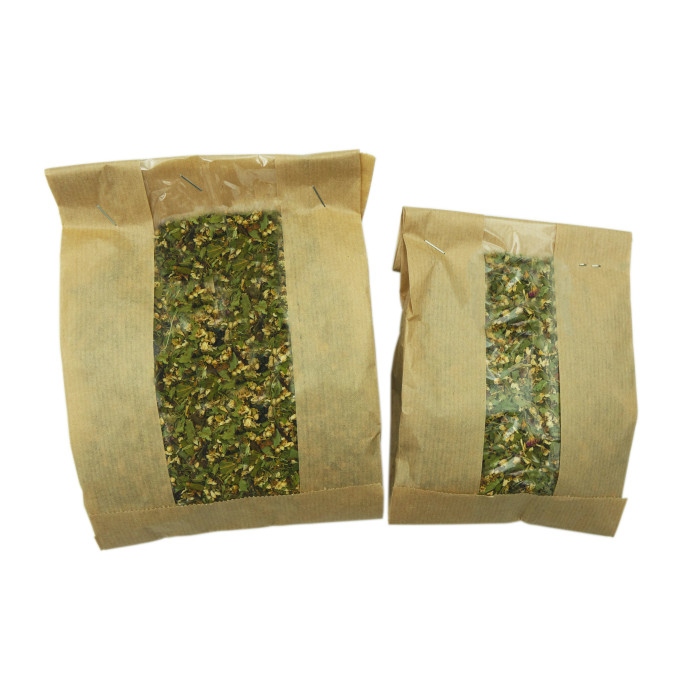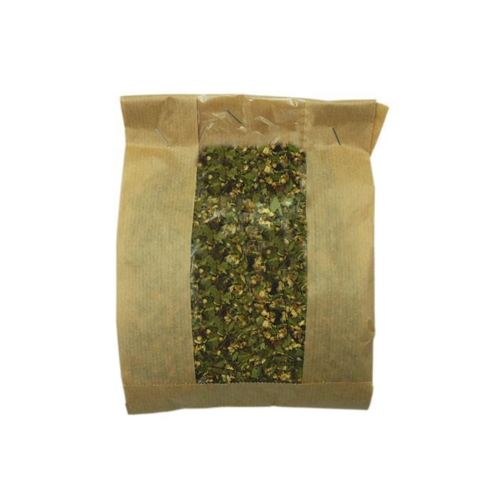 - Дві столові ложки суміші квіток і листя глоду колючого (30 г), трави хвоща польового (15 г), омели білої (З0 г), квіток бузини чорної (З0 г), слані ламінарії цукристої (5 г), листків меліси лікарської (5 г), м'яти перцевої (5 г), трави наберу садового (5 г), собачої кpoпиви звичайної (25 г), фіалки триколірної (15 г), листя берези пухнастої (15 г), кореневищ з корінням валеріани лікарської (10 г) і трави барвінку малого (15 г) заливають 250 мл окропу, кип'ятять 5 хв, настоюють до охолодження, проціджують і випивають протягом дня за 3 рази після їди при гіпертонічній хворобі (збір використовується в болгарській офіційній медицині).