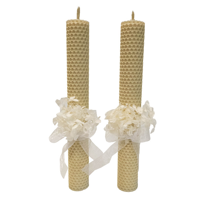 Ніжні вінчальні свічки ручної роботи, виготовлені з натуральної вощини молочного кольору. Кожна свічка прикрашена стабілізованою гортензією та витонченими стрічками, що надає їй святкового та символічного вигляду.