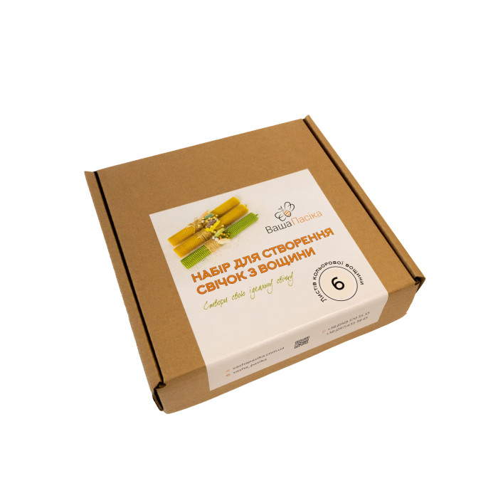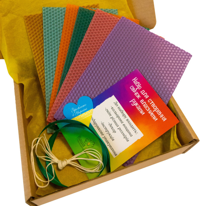 Дозвольте Вашій креативності проявитись у процесі виготовлення свічок з вощини. Кольорова вощина для виготовлення свічок стала популярною відносно недавно. Робити свічки з кольорової вощини дуже зручно, не потрібні додаткові інструменти, просто вставте гніт і скрутіть лист у свічку. При виготовленні вощини використовують тільки органічні барвники, щоб не втратити неповторний медовий аромат, що виходить від воскового листа. Такий набір стане чудовим подарунком для Ваших близьких і друзів.
