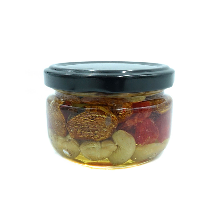 Асорті горішки в меді – це витончене поєднання найкращих природних смаків, яке підкорить навіть найвибагливіших гурманів. Хрусткі горішки, занурені в натуральний мед, доповнені соковитою кислинкою вишні, створюють справжню симфонію смаку та користі.