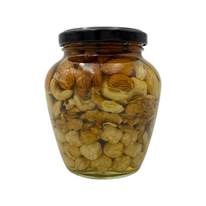 Горіхове асорті з медом – надзвичайно поживний смаколик, що поєднує в собі цілющі властивості відбірних горішків і ніжного акацієвого меду.