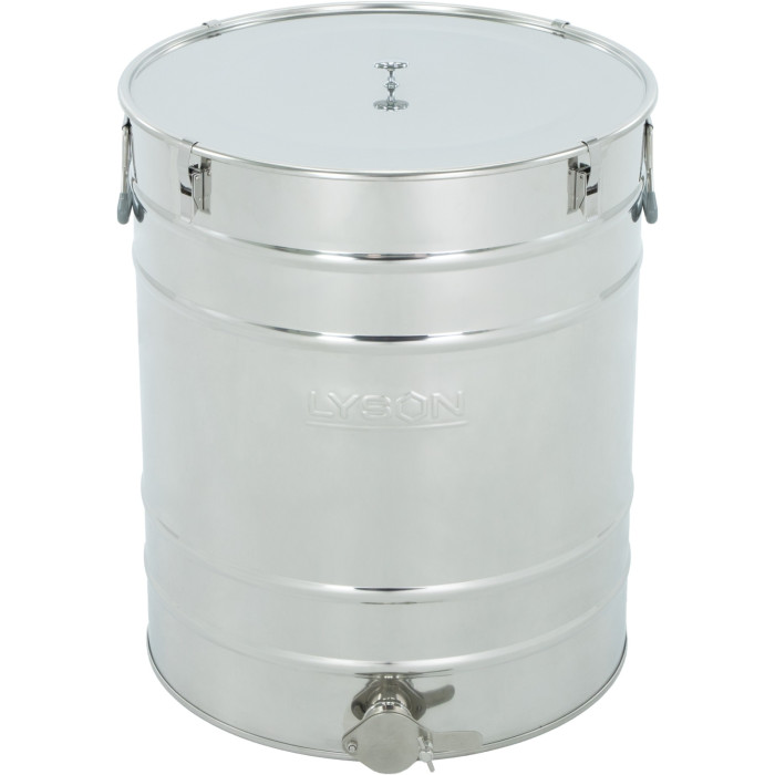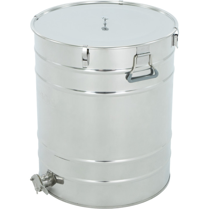 Після відкачування мед має відстоятися і саме на цьому етапі важливо, щоб все пішло правильно. W714_K Відстійник нержав. 100л. (~140кг.) з клапаном нержав. 6/4 CLASSIC (з прокладкою та защіпками) - надійний, простий у використанні і створений, щоб мед завжди залишався чистим, прозорим і готовим до продажу, забезпечуючи порядок у меді без зайвих зусиль.