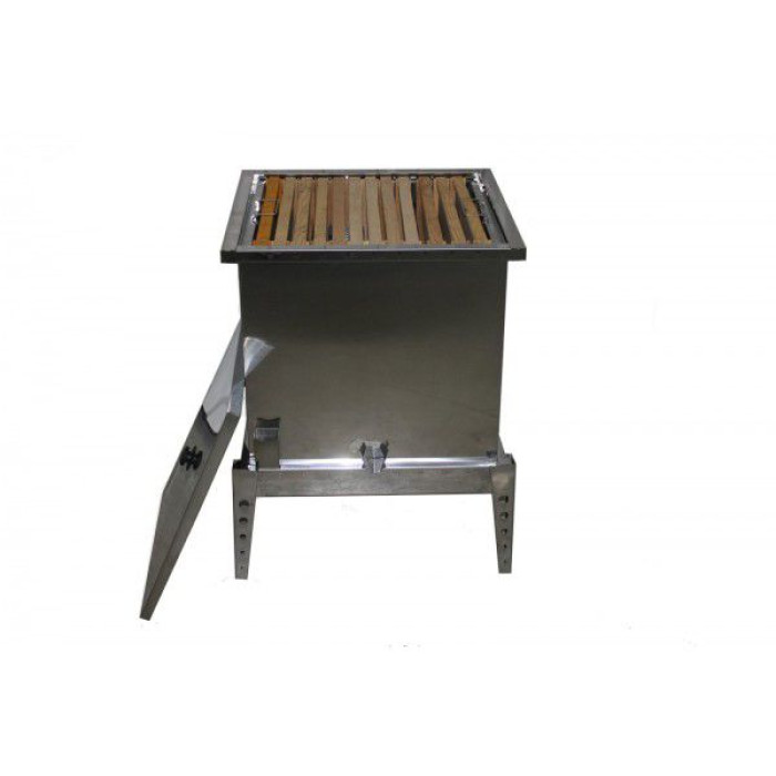 Конструкція воскотопки передбачає бак, перфорований кошик з ручками та ніжки. У баку вмонтований злив для воску та лійка для рівня води.