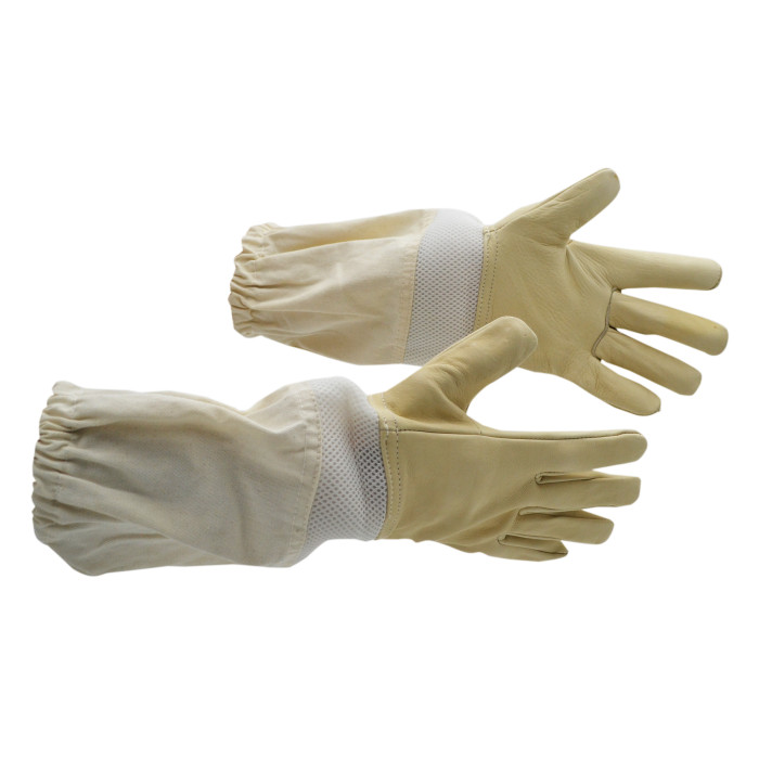 Особливість цих рукавиць - додаткова вентиляція. Вставка з сіточки краще пропускає повітря і не затримує вологу. Основа пошита з натуральної шкіри. Гумка на кінці нарукавника не дає бджолам пролізти в середину рукавиць та під комбінезон.