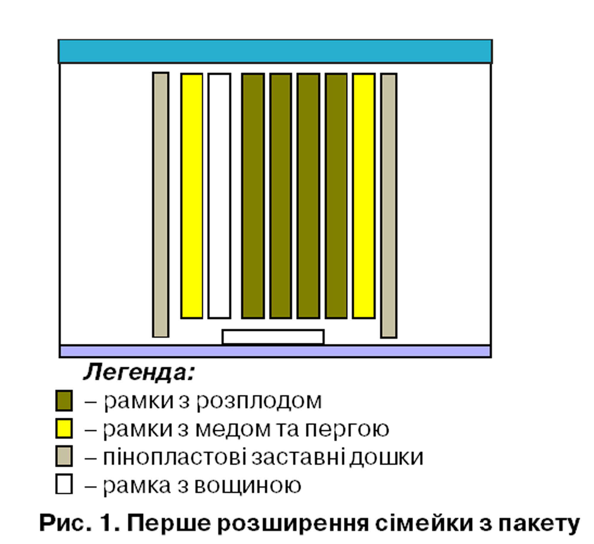 Перше розширення пакета навощеними рамками роблять приблизно на 7–8-й день після переселення бджіл у вулик. Класично навощені рамки, як і в сімейці з пакета, так і в перезимувалій сім’ї, розміщують одразу після останньої рамки, на якій є розплід(рис. 1). Таке розширення не розриватиме розплідного гнізда бджолосім’ї та не погіршуватиме температурного режиму в ньому. Навесні, коли ще є ймовірність повернення заморозків, а сім’я ще недостатньо сильна, встановлення рамок з вощиною усередину гнізда (між рамками з розплодом) може спричинити переохолодження розплоду, а відповідно і виникнення гнильцевих захворювань розплоду, з якими дуже і дуже важко боротися.