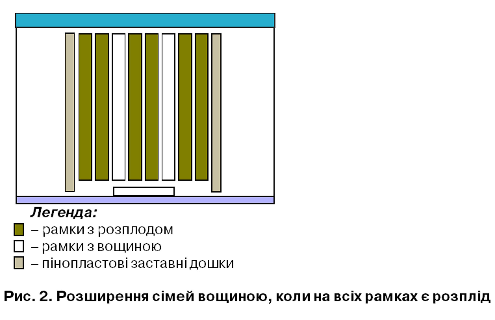Проте, коли на одній зі сторін крайніх рамок є розплід, а у природі є підтримувальний взяток, то рамки з вощиною можна ставити і врозріз гнізда (рис. 2). Такі сім’ї через 4–5 днів варто оглянути, і якщо бджоли відбудували вощину, а матка зачервила відбудований щільник, то їх знову розширюють вощиною.