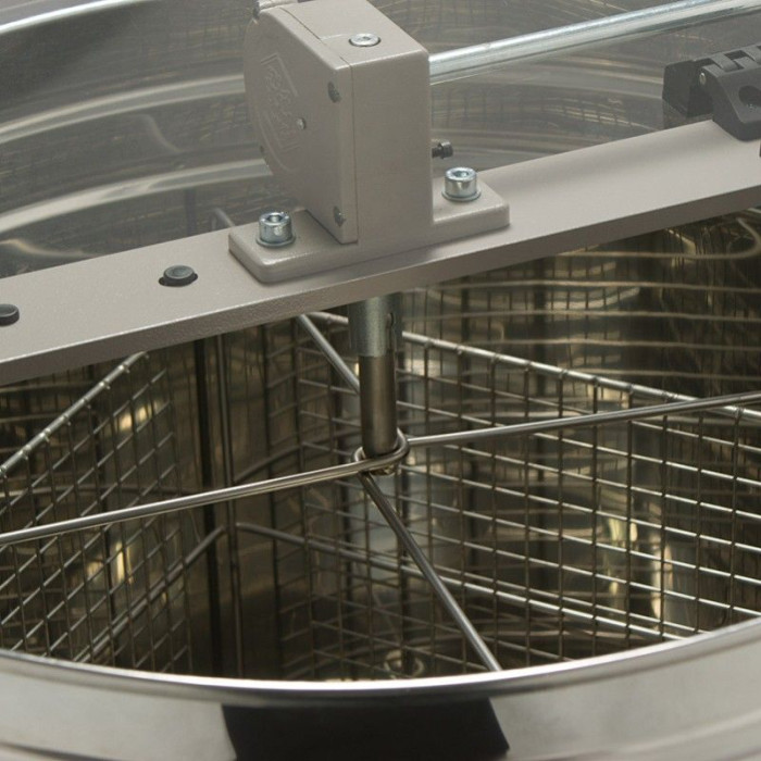 Крышка прозрачная, изготовлена из органического стекла. Это позволяет наблюдать за работой медогонки, не открывая ее. Крышка защищает медогонку от пчел, пыли и от попадания внутрь посторонних предметов при вращении медогонки.