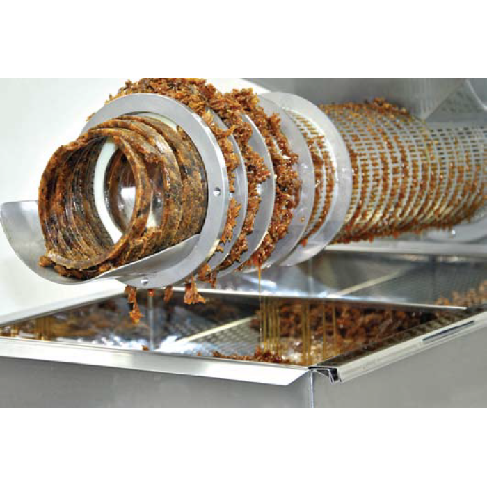 Отделение происходит внутри цилиндра с перфорированными отверстиями - мед проходит через перфорацию и при помощи разделительного вала попадает на сито. Отделенный от меда воск остается внутри экструдера, где прессуется в брикет винтом и выталкивается наружу. На выходе пчеловод получает сухой брекет воска, пригодный для повторной переплавки.