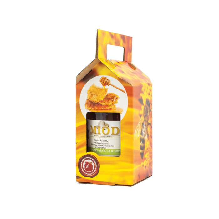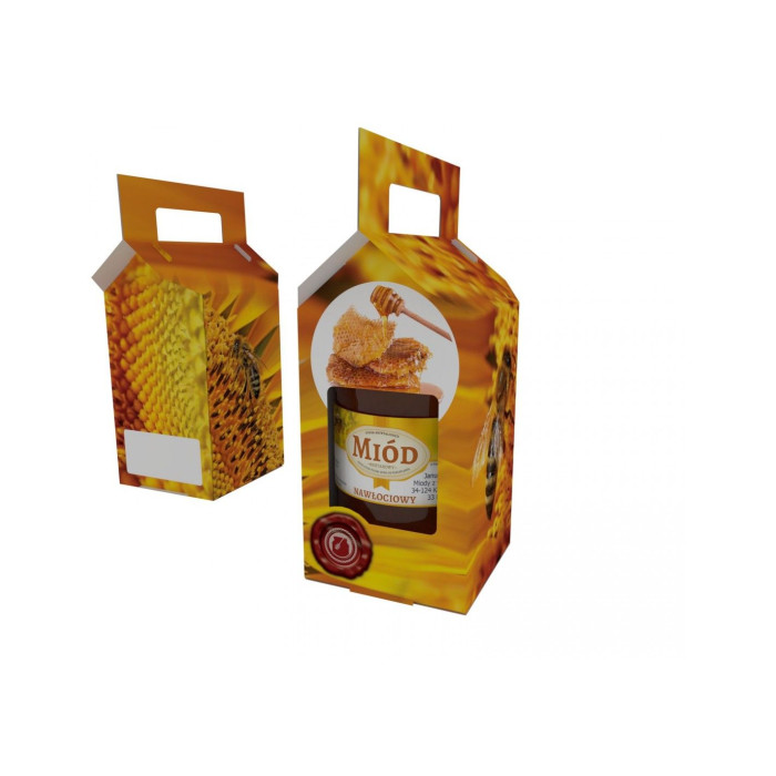 На упаковке есть место для указания адресных данных пасечника. Упаковка имеет твердое дно и прочную ручку, разработанную таким образом, чтобы коробка выдержала вес полной банки меда (900 мл).