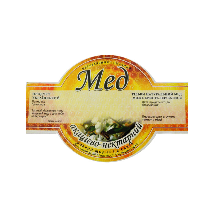 Етикетка оригінальної форми має лаконічний дизайн, буде гарманійно виглядати на тарі будь-якої форми, матералу і об’єму. Це привертатиме увагу покупців і збільшить кількість проданого меду. Так як на етикетці вказані вид меду і ваші контакти, велика ймовірність, що покупець знову купить мед у вас.