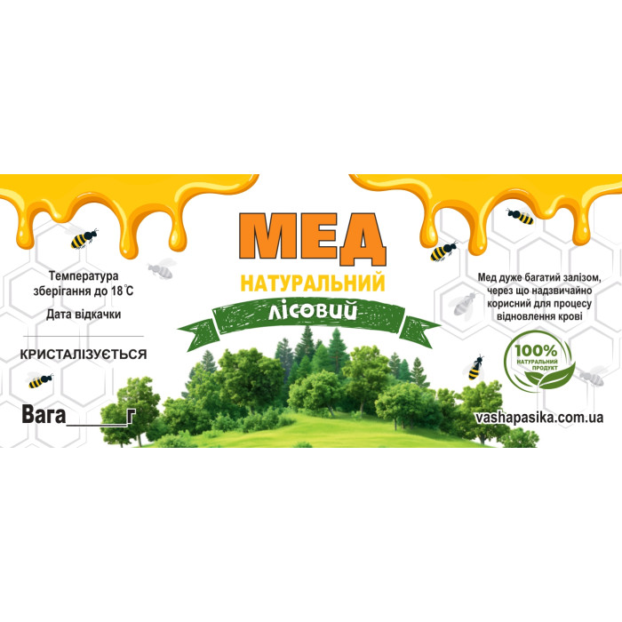 Етикетка Мед лісовий є спеціалізованим маркуванням для меду, зібраного з лісового різнотрав’я, ягідних кущів та диких дерев. Дизайн акцентує увагу на природній силі.