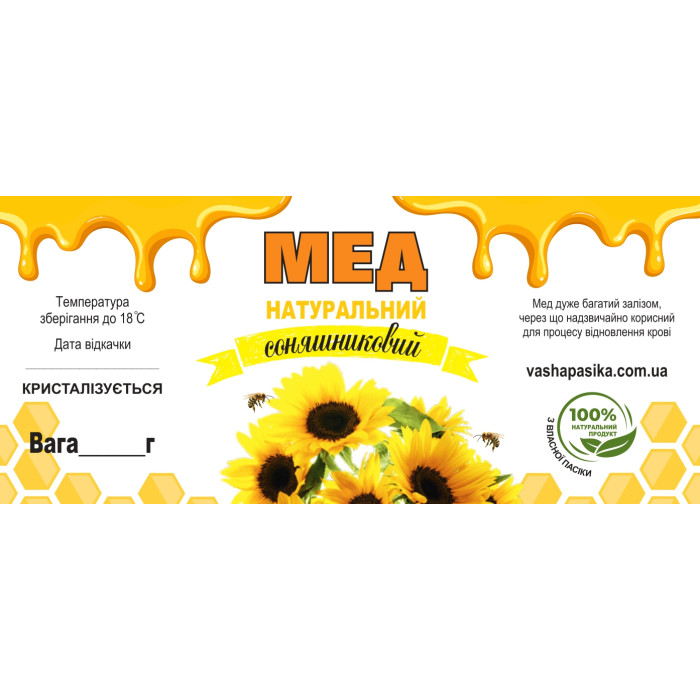 Етикетка Мед Соняшниковий створена для того, щоб вигідно представити продукт та підкреслити його натуральність. Вона містить ключову інформацію та формує перше враження, допомагаючи покупцю зробити правильний вибір.