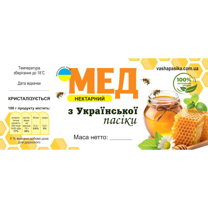 Етикетка для меду “Мед з Української пасіки” - це етикетка, яка підкреслить натуральність Вашого продукту, зробить упаковку привабливою та допоможе покупцеві одразу отримати всю необхідну інформацію. Завдяки сучасному дизайну та національним акцентам етикетка виглядає яскраво, професійно й довірливо.