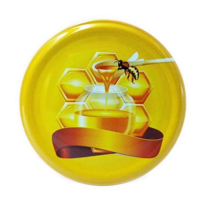 Зовнішній вигляд Ваших скляних банок прикрасять металеві кришки. Кришка виготовлена з легкого металу, що гарантує її щільність та надійність для безпечного зберігання Вашого меду. А оригінальний тематичний малюнок у вигляді сот та бджілки з кувшином меду відразу приверне увагу покупця.