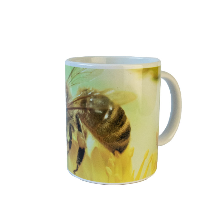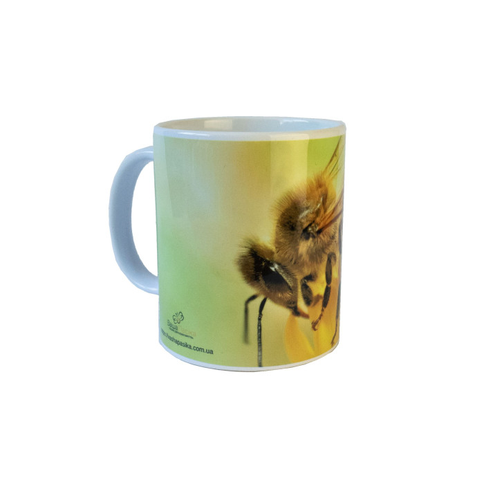 Декор: горнятко прикрашене яскравим зображенням бджоли на квітці. Насичені жовті відтінки передають тепло та природну енергію, роблячи малюнок живим і привабливим.
