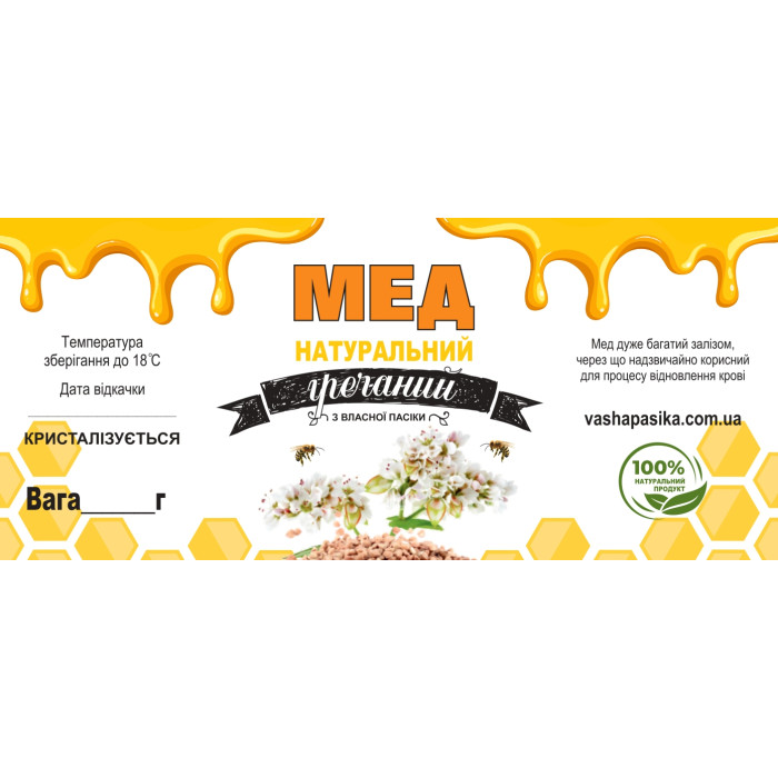Якщо Ви фасуєте гречаний мед, Вам потрібна етикетка, яка промовляє до покупця про його користь та якість. Замовте спеціалізовану етикетку «Мед гречаний» зараз, щоб надати своєму продукту потужну перевагу на ринку та підкреслити його цінні властивості!