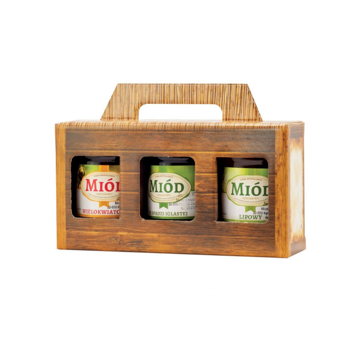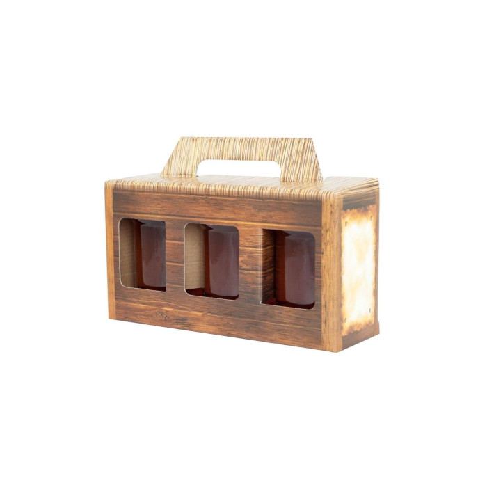 Притягує погляди споживачів, ідеально підходить для подарунка. Має місце для адресних даних пасічника. Міцне дно та міцна ручка розроблені таким чином, що коробка витримує вагу 3 банок ємністю 315 мл.