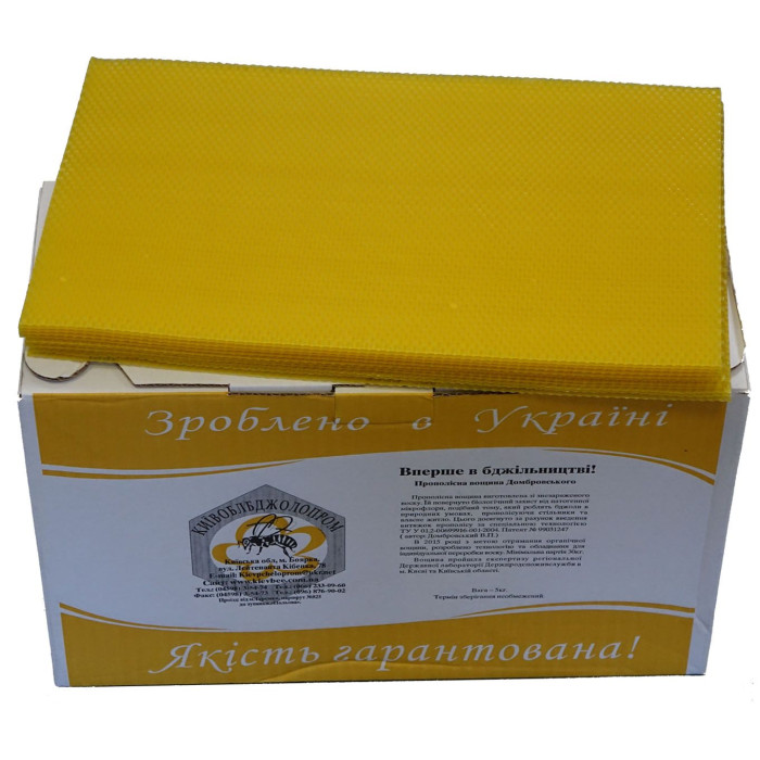 Вощина Дадан прополісована (Київська) - це якісна натуральна вощина додатково збагачена прополісом, що створює максимально природні умови для життя бджіл у вулику. Вона виготовляється з чистого бджолиного воску з додаванням прополісу, має приємний природний аромат і добре сприймається бджолами з перших днів установки в рамку. Завдяки прополісу вощина набуває додаткових захисних властивостей. Прополіс відомий своїми антисептичними та зміцнюючими якостями, тому така вощина сприяє підтриманню здорового мікроклімату у вулику, зменшує ризик розвитку хвороб та стимулює активну роботу бджіл.